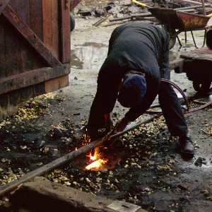 In diesem Bild sieht man, wie die Weiche von den alten preußischen Hakenplatten befreit wird; bei dieser Weiche der Gleisform "8" wurden sie gegen Rippenplatten der Form "K" ausgetauscht.