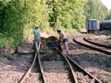 In Handarbeit wurden die Schienen und Weichen abgebaut und in Schrott und Wiederverwertbares getrennt. Allerdings blieb da nicht viel, denn die alten Gleise (überwiegend Form 6) waren teils mit einfachen Platten und jeweils drei Schrauben befestigt gewesen, die Neuerstellung erfolgte natürlich in Form "K".
