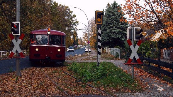 Der Triebwagen erreicht den Bahnhof Schönow, oben sehen wir ihn beim Überqueren des Dahlemer Weges, im Bild links hat er bereits das Einfahrgleis 5 und im unteren Bild sein Ziel am Bahnsteig erreicht.